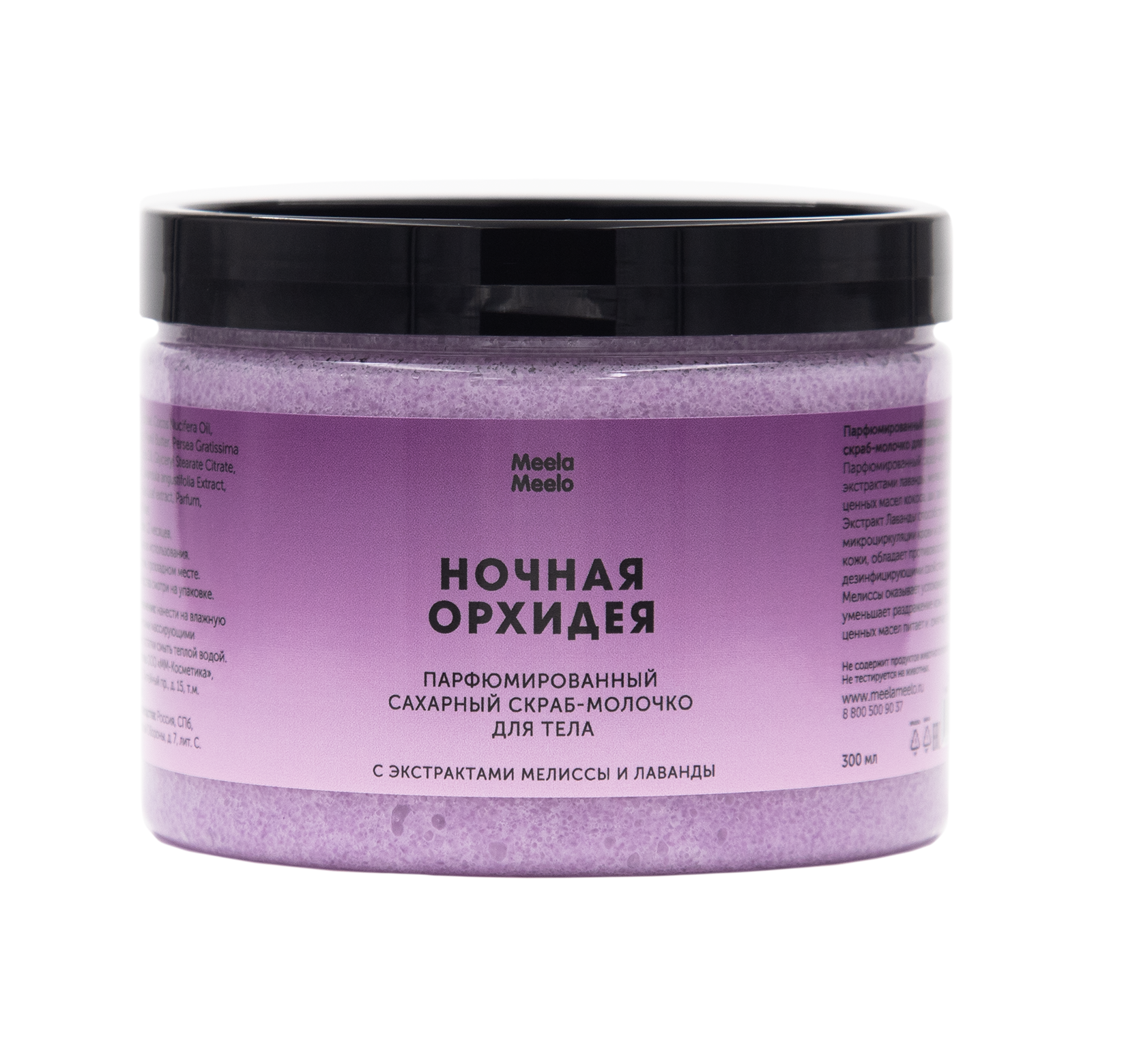 Парфюмированный скраб-молочко для тела с экстрактами лаванды, мелиссы и комплексом ценных масел кокоса, ши, авокадо, миндаля.