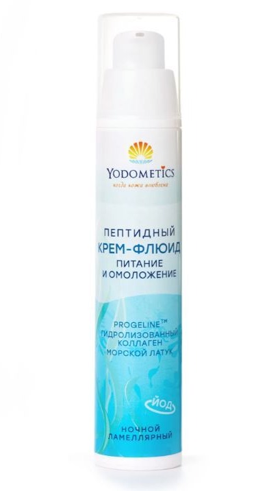 Уникальный ночной крем-флюид «Yodometics» на ламеллярной эмульсии с природными пептидами, экстрактом Ulva Cactuca (Морской латук) обеспечивает длительное питание и увлажнение в ночное время. Масла арганы, макадамии, миндаля и виноградной косточки делают кожу гладкой и эластичной. Комплекс Проджелин содержит пептид, обладающий доказанной антивозрастной активностью, оказывает выраженное подтягивающее и укрепляюшее действие на кожу лица.